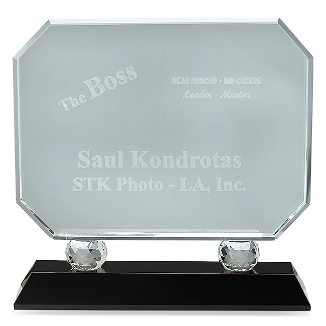Great bosses will always be appreciated, but may not get the recognition for his or her leadership and support of your team or department. If you have a great boss or department head, you may want take a look at our Boss award for the annual party or awards dinner! It’s a clear crystal rectangular award, set on a jet black crystal base. The corners and edges are beveled for a contemporary, stylish appearance, and it is sure to look elegant on his desktop! You can add a sense of humor to all the accolades with the artwork at the top of the crystal, which states: “The Boss … Head Honcho, Big Cheese, Leader, Mentor”. We will add the boss’ name, laser-engraved below the artwork, and we’ll package the award in an attractive gift box that is suitable for presentation at the ceremony! Any boss would be proud to display such a prestigious award, and to know that he or she is appreciated for all that they do!