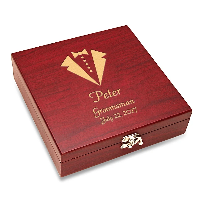 Your Best Man and groomsmen will appreciate this gift when you present it at the rehearsal dinner! It’s a rosewood -finished wood case with an ornate clasp that features our laser-engraved Tuxedo design, personalized for free with the groomsman’s name, wedding title, and date of the wedding laser-engraved on the top. Inside the box are a 5 oz. stainless steel flask, shot glass, funnel, 5 dice and deck of cards. The set comes packaged in a handsome gift box.