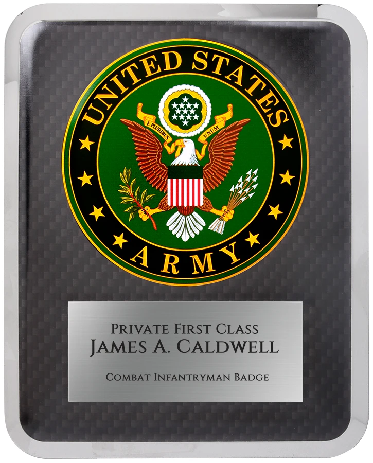 This personalized US Army Plaque is a great gift to commemorate the accomplishments of our heroes in the Military. Finished in polished carbon fiber, it features a full color US Army emblem. The rectangular plate below this will be personalized with your customized text free of charge.