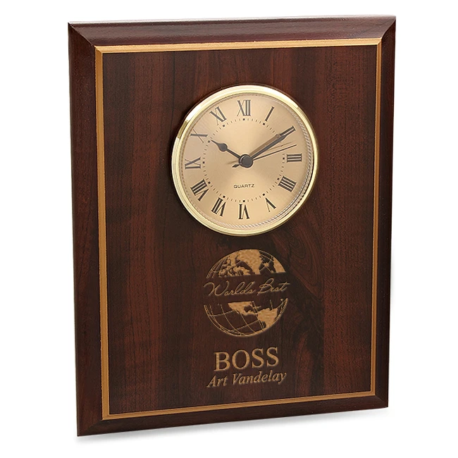 Give your Boss a wall plaque he will be proud to hang on his office wall! This cherry wood recognition wall plaque has a gold border, and is inset with a battery-operated quartz clock with a gold dial, black Roman numerals and black hands. The plaque features our laser-engraved World’s Best Boss design with space beneath it for the Boss’s name, laser-engraved at no extra charge. This meaningful gift item comes packaged in a handsome gift box that’s ready to surprise the Boss for any special occasion!