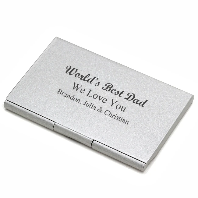 Get him a business card case that displays his most important job title, world’s best dad. This solid metal business card case does just that! It is made of solid steel with a rich acrylic finish. The words “World’s Best Dad” are laser engraved right into the lid in a thick, script font. Below that, you’ll add your own customized text free of charge, creating a personalized keepsake gift that is perfect for father’s day, birthdays and anniversaries. This father’s day business card case holds up to fifteen business cards and it comes packaged in a gift box.